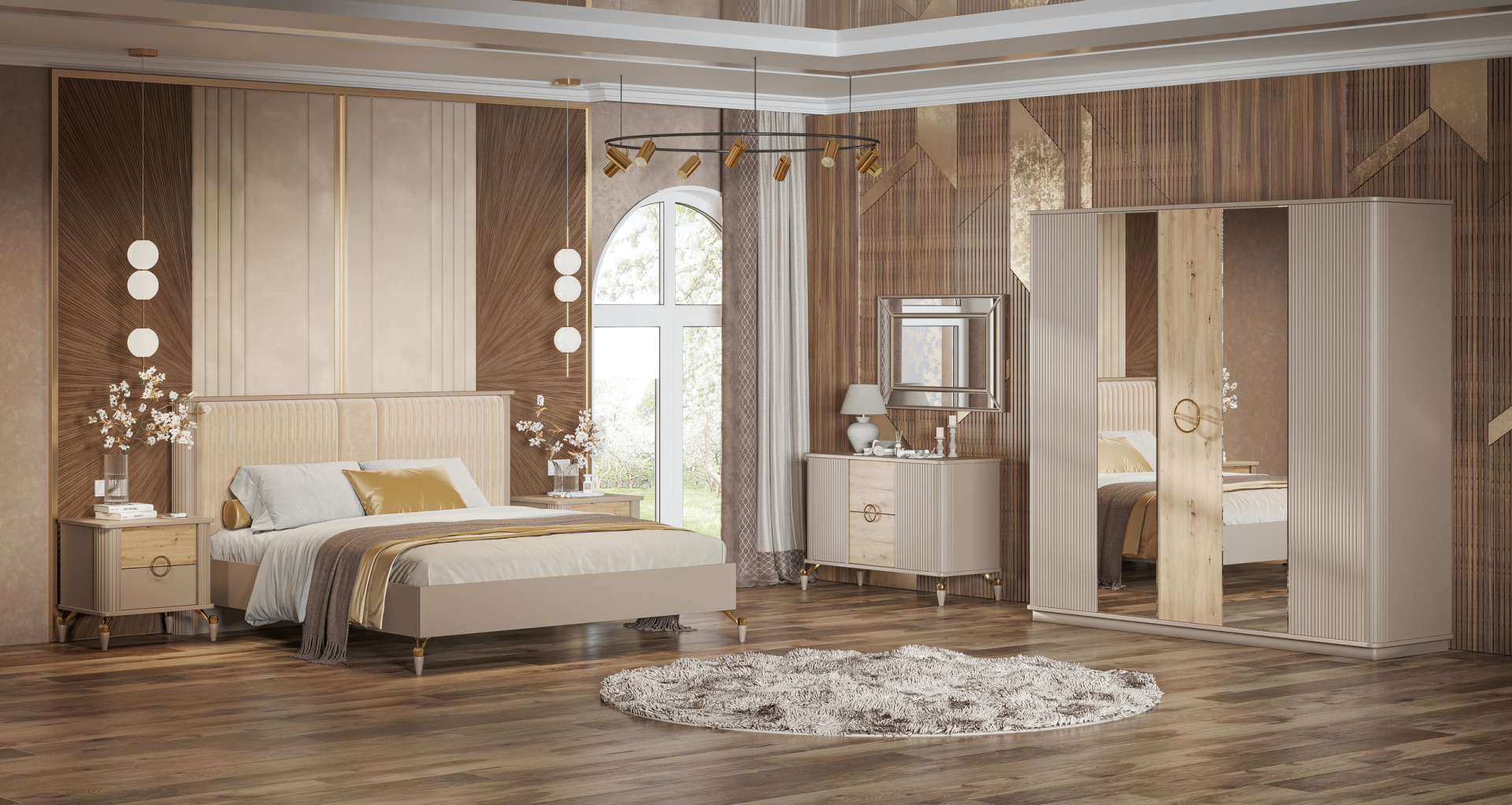 Спальный гарнитур «Мадрид» – для тех, кто предпочитает современные и минималистичные решения в интерьере. Нежные оттенки в сочетании с деревянными элементами создают в интерьере неповторимую теплую атмосферу. Такой стиль отлично будет смотреться в интерьере любого стиля.