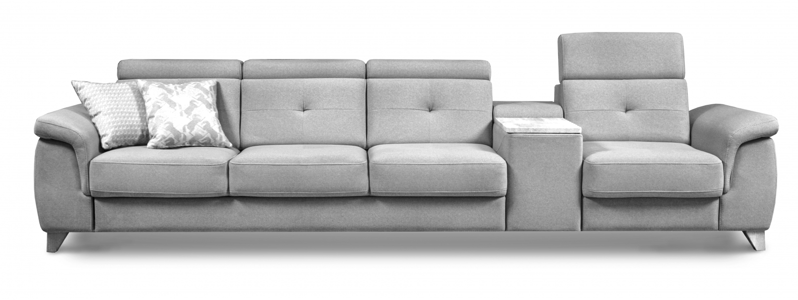 Оригинальные утяжки на спинках и сидениях подчёркивают мягкость модели. Регулируемые подголовники, бар с розеткой на 220V и двумя USB разъёмами приглашают насладиться отдыхом. «Кватро» парит над поверхностью пола, благодаря высоким опорам высотой 10см. На выбор предлагаются три цвета опор из массива дерева и вариант из хромированной стали. Размер спального места в линейном диване 130х185см, в угловом диване – 130х210см.