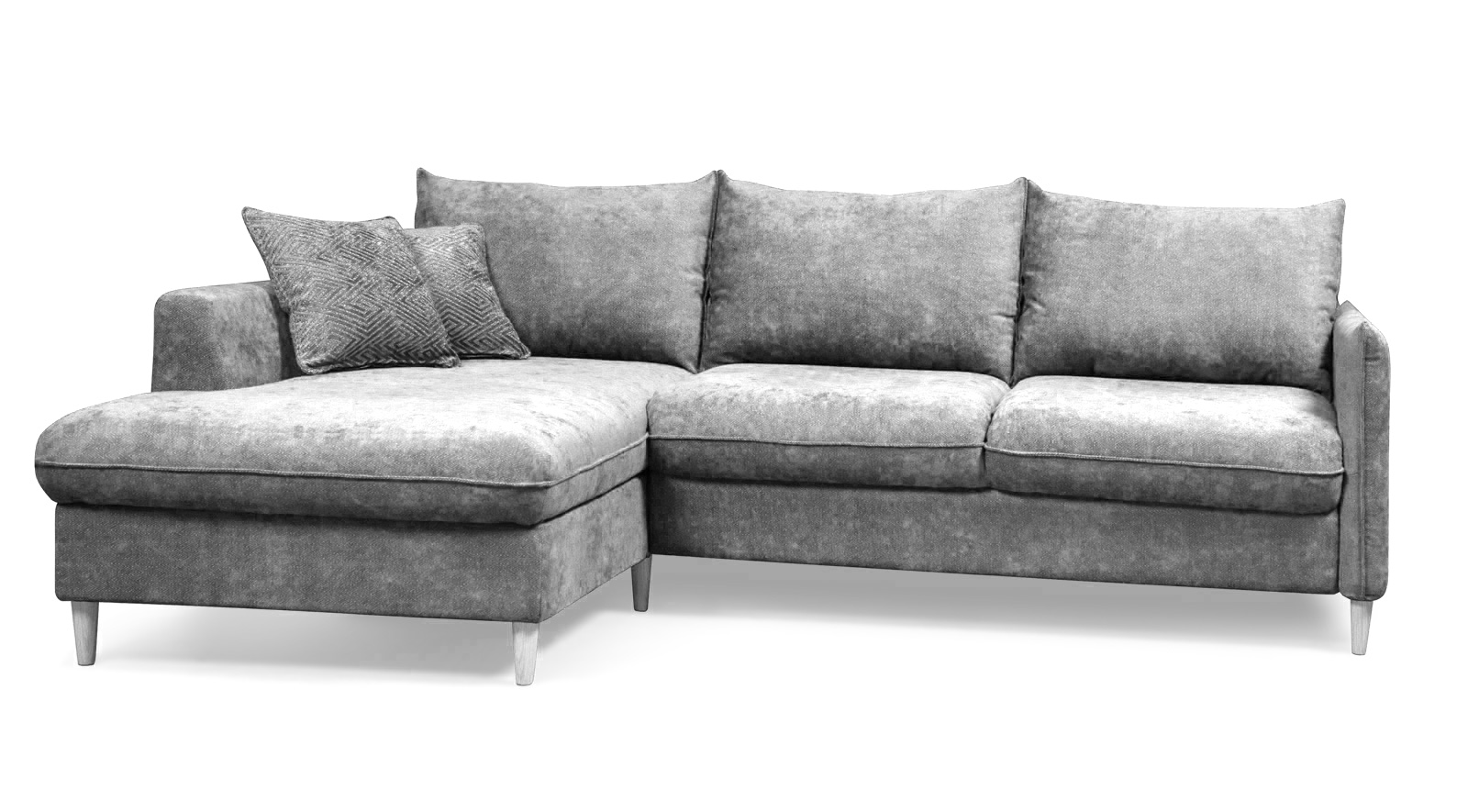 При относительно небольших габаритных размерах угловой диван имеет просторное спальное место размером 140 х 210 см. Под сидением шезлонга находится ламинированная ниша. Современный механизм трансформации спального места «пума» раскрывается над поверхностью пола, не оставляя следов на напольных покрытиях и коврах. На выбор предлагаются два вида опор высотой 12 см : из массива дуба и металлические.