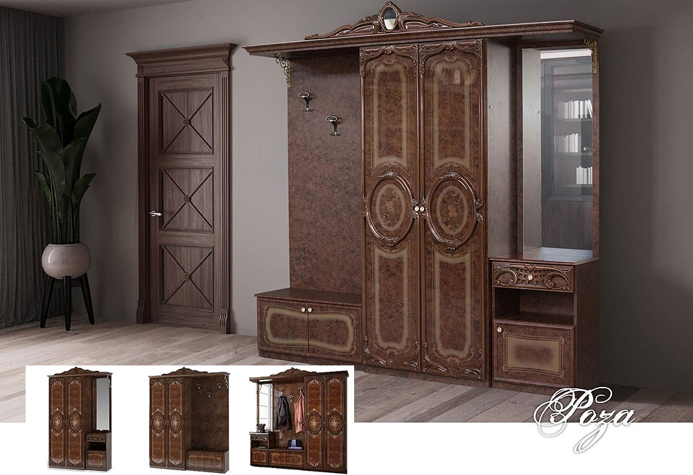 Эксклюзивная прихожая Роза высокого качества российского производства с богатой отделкой и обилием эффектных декоративных элементов.