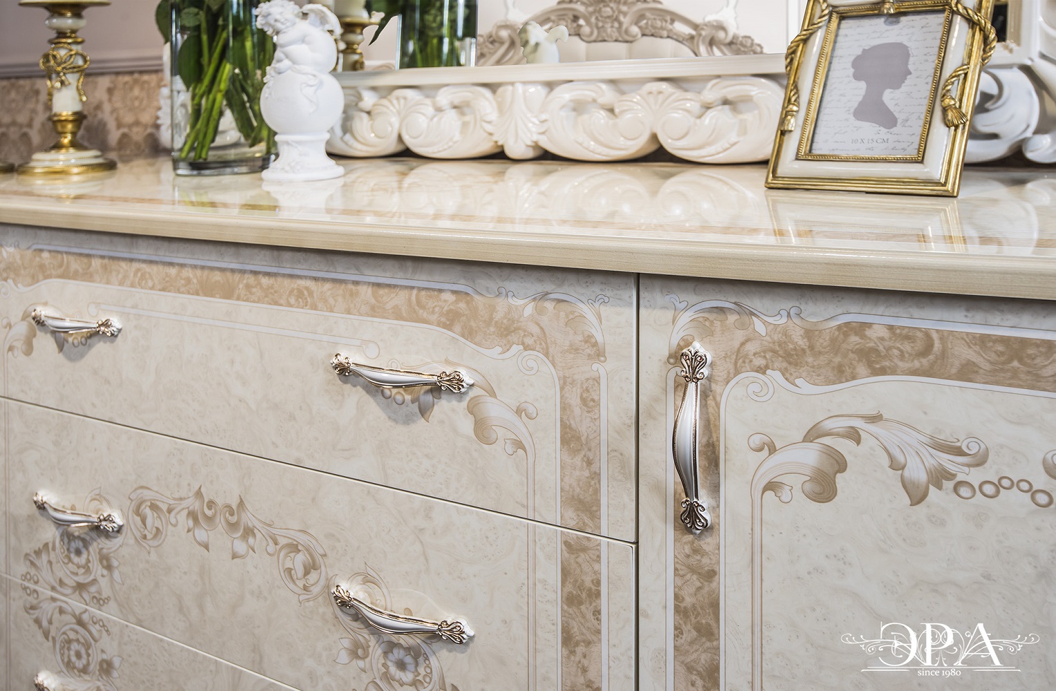 Декоративные элементы, фасады, накладки покрыты золотой, темной патиной и матовым лаком</li>