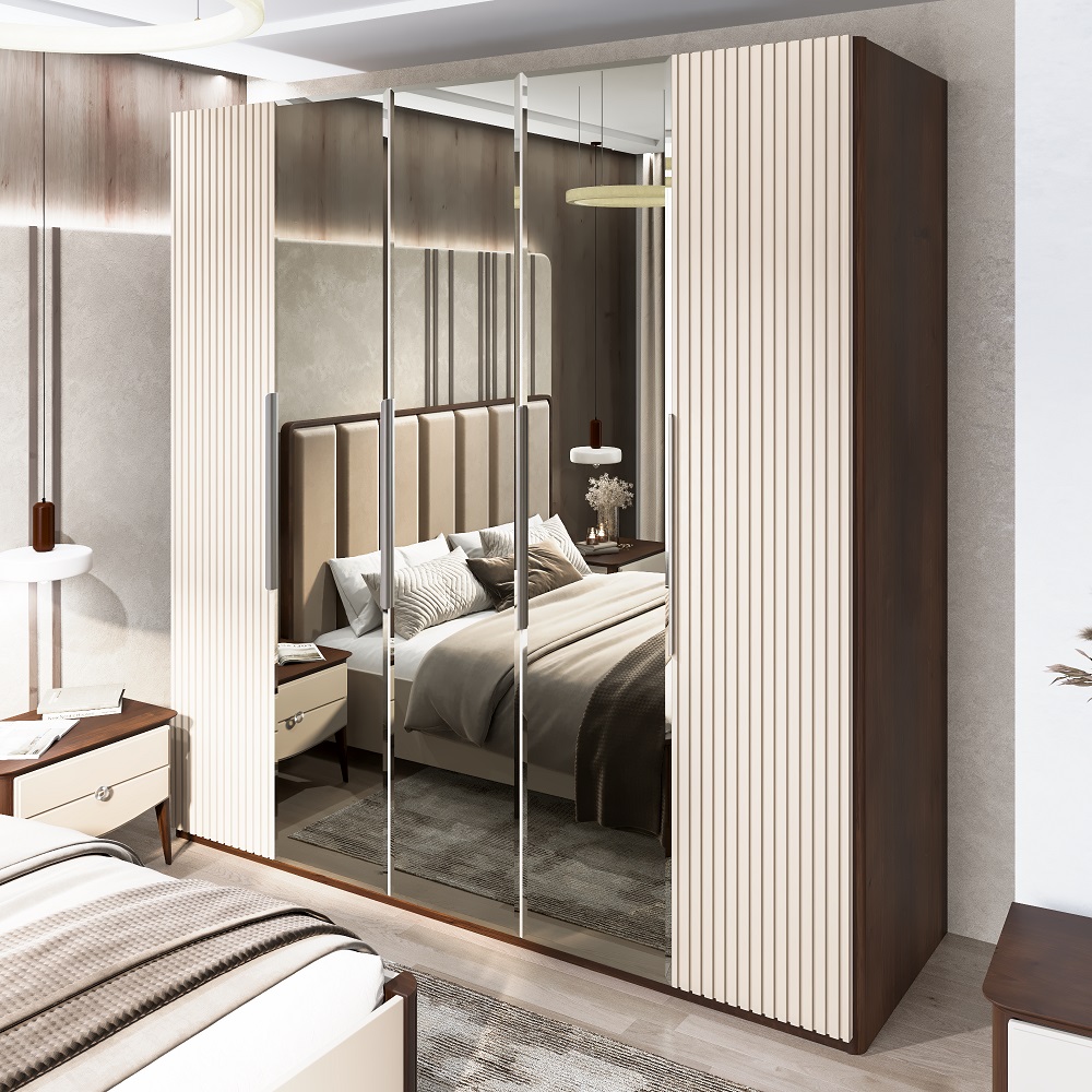Шкаф Жаклин Корпус: ЛДСП Kronospan 16 мм; закгругленный, текстура караваджо Фасад: Фасад МДФ с рельефной фрезеровкой , покрытый эмалью мокко беж Зеркало: 3 зеркала с фацетом. Приклеивается по технологии полного закрашивания полотна клеем, затемненные-бронза/дымчатая тонировка бронзато; Внутреннее наполнение: Шкаф разделен на 4 секции (1+2+1+1), крайние 1ств — 4 полки, 2х и 1 ств. средние — 2 полки,1 штанга; Фурнитура: фурнитура с доводчиками; Ручки: из металла ,Salice Италия, цвет сатин, форма профиль
