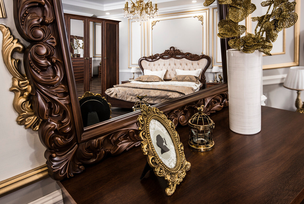 • Декоративные элементы, фасады, накладки покрыты темной патиной и матовым лаком на водной основе