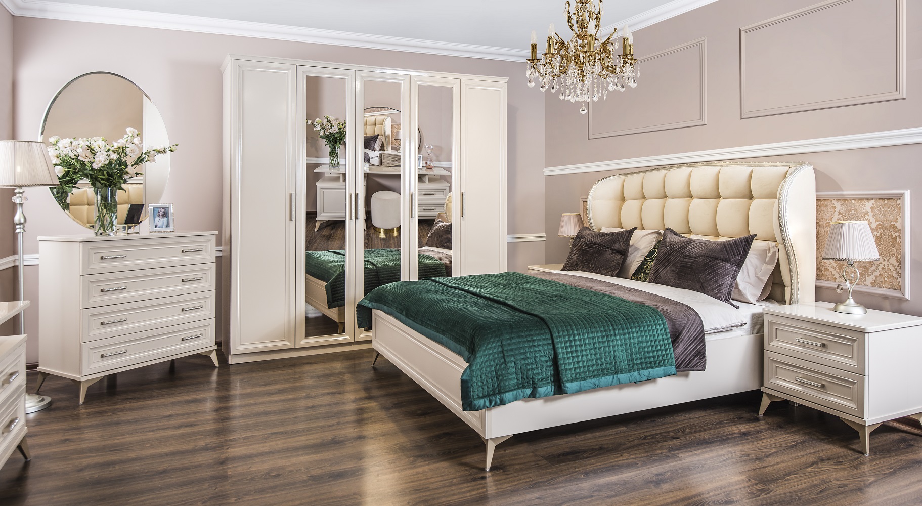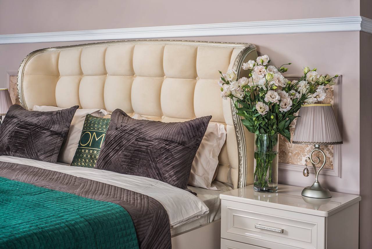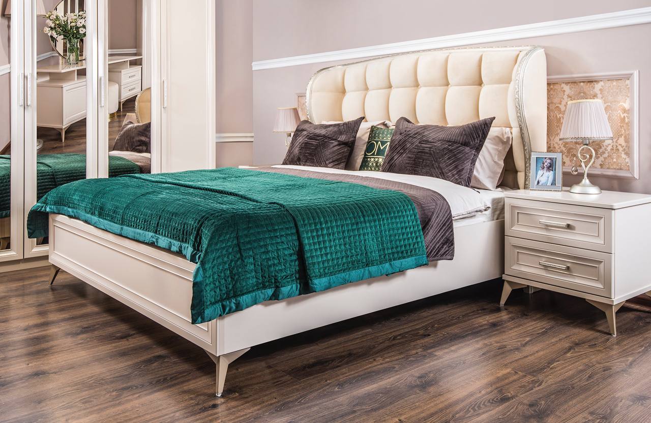 Мебель для спальни Нонна имеет множество преимуществ — от безупречного внешнего вида до качества материалов и срока службы. Предметы этой линии выполнены в стиле неоклассики и наделены максимальной функциональностью. Благодаря этому мебель идеально вписывается в соответствующий интерьер. Утонченные элементы, роскошная обивка, витиеватые накладки доставят эстетическое наслаждение своим владельцам. Цвет мокко Нонна мебели позволяет визуально увеличить пространство спальни, подчеркнуть важные детали, добавив в пространство легкости и света. Компания-производитель «ЭРА» доставит товар в любой уголок страны, чтобы создать там царство роскоши и элегантности. Цвет - мокка Фасады –крашенные фасады из МДФ с фрезеровкой Корпус – ЛДСП На изголовье и изножье находится мягкое основание Фурнитура – производители фирм BOYARD, HAFELE, SALICE все двери шкафов и ящики оснащений доводчиками. Шкаф 5-ти ств. - Ш 2275*Г 580*В 2245 Кровать (1800х2000) - Ш 1905*Г 2145*В 1415 Тумбочка (2 шт) - Ш 590*Г 490*В 580 Комод 4 ящ. - Ш 940*Г 530*В 975 Зеркало ППУ - Ш 870*В 1100