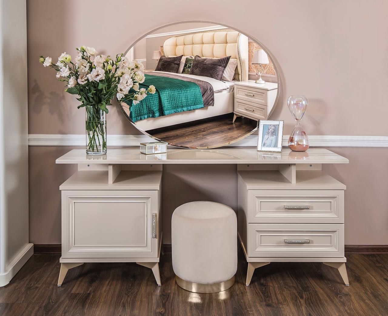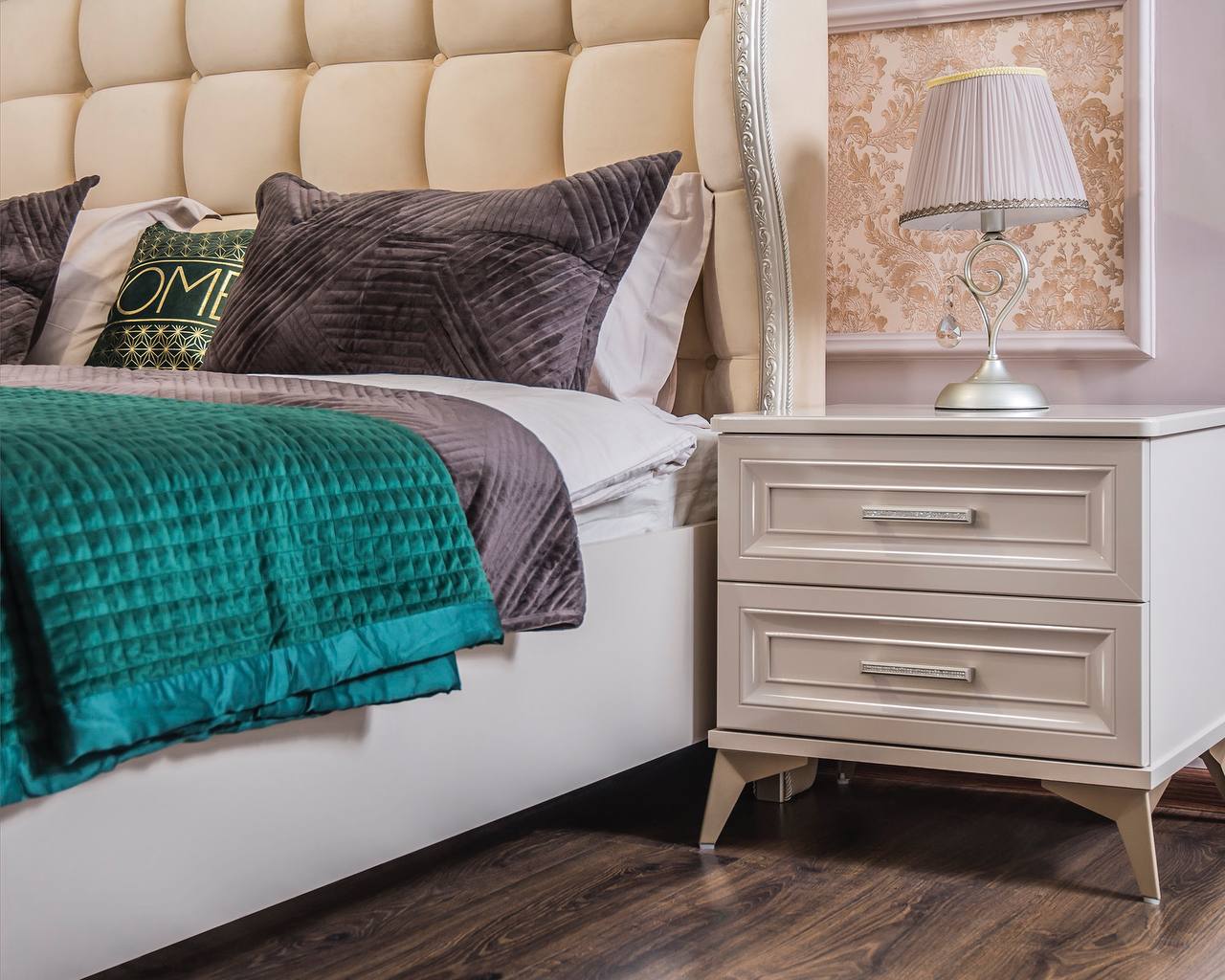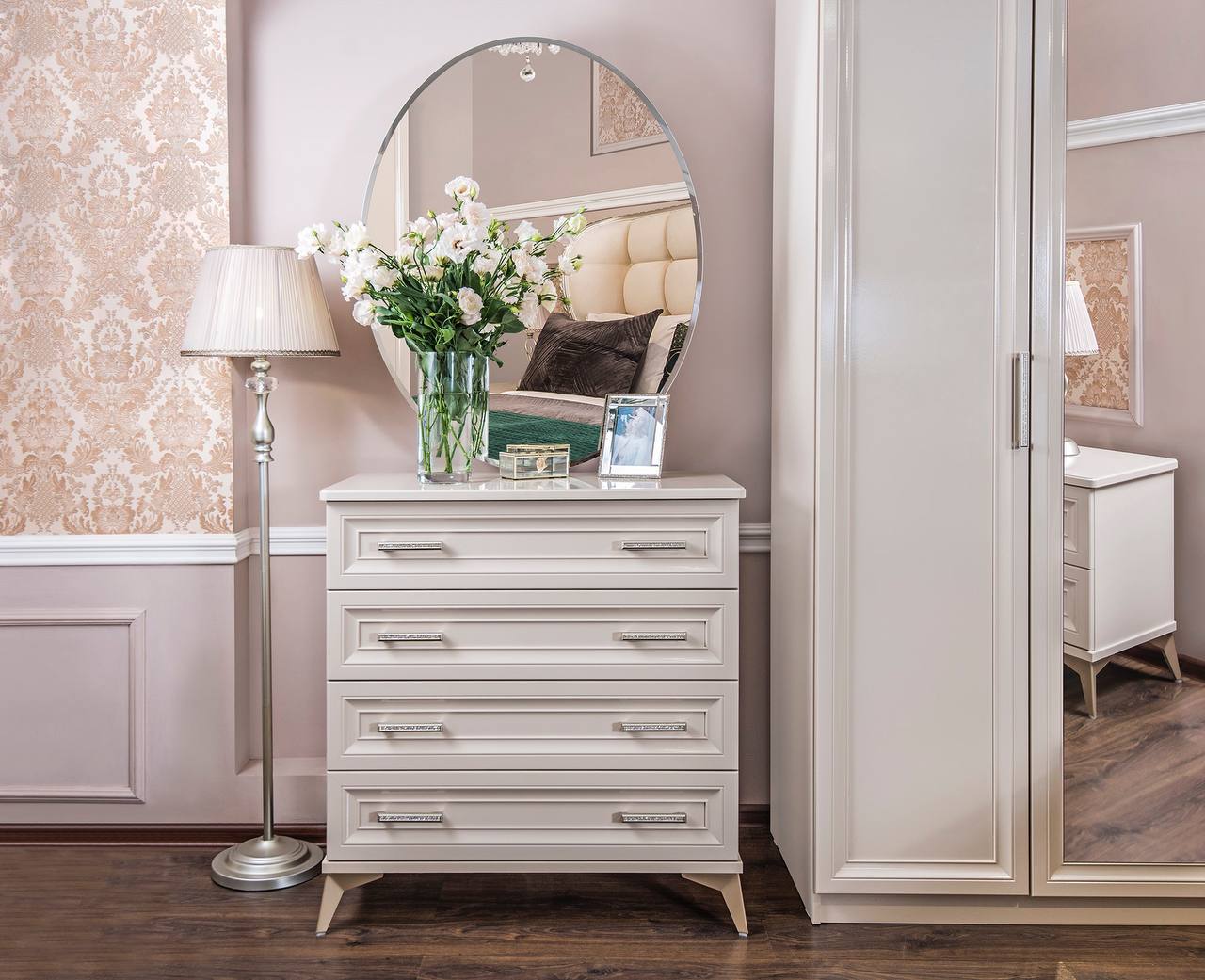 Мебель для спальни Нонна имеет множество преимуществ — от безупречного внешнего вида до качества материалов и срока службы. Предметы этой линии выполнены в стиле неоклассики и наделены максимальной функциональностью. Благодаря этому мебель идеально вписывается в соответствующий интерьер. Утонченные элементы, роскошная обивка, витиеватые накладки доставят эстетическое наслаждение своим владельцам. Цвет мокко Нонна мебели позволяет визуально увеличить пространство спальни, подчеркнуть важные детали, добавив в пространство легкости и света. Компания-производитель «ЭРА» доставит товар в любой уголок страны, чтобы создать там царство роскоши и элегантности. Цвет - мокка Фасады –крашенные фасады из МДФ с фрезеровкой Корпус – ЛДСП На изголовье и изножье находится мягкое основание Фурнитура – производители фирм BOYARD, HAFELE, SALICE все двери шкафов и ящики оснащений доводчиками. Шкаф 5-ти ств. - Ш 2275*Г 580*В 2245 Кровать (1800х2000) - Ш 1905*Г 2145*В 1415 Тумбочка (2 шт) - Ш 590*Г 490*В 580 Комод 4 ящ. - Ш 940*Г 530*В 975 Зеркало ППУ - Ш 870*В 1100