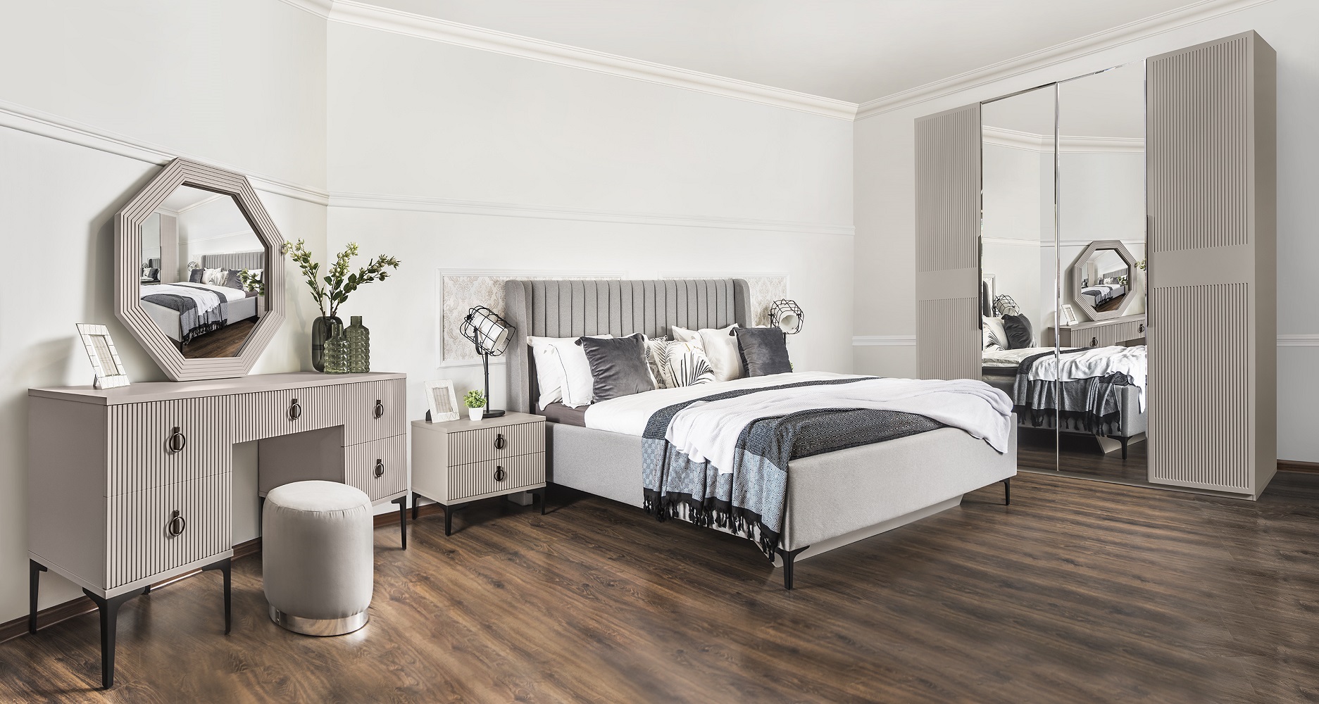 Двуспальная кровать Стелла 160 / Зеркало для туалетного стола Стелла / Прикроватная тумбочка Стелла светло серый / Туалетный стол Стелла светло серый / Шкаф Стелла 4-ти створчатый серый