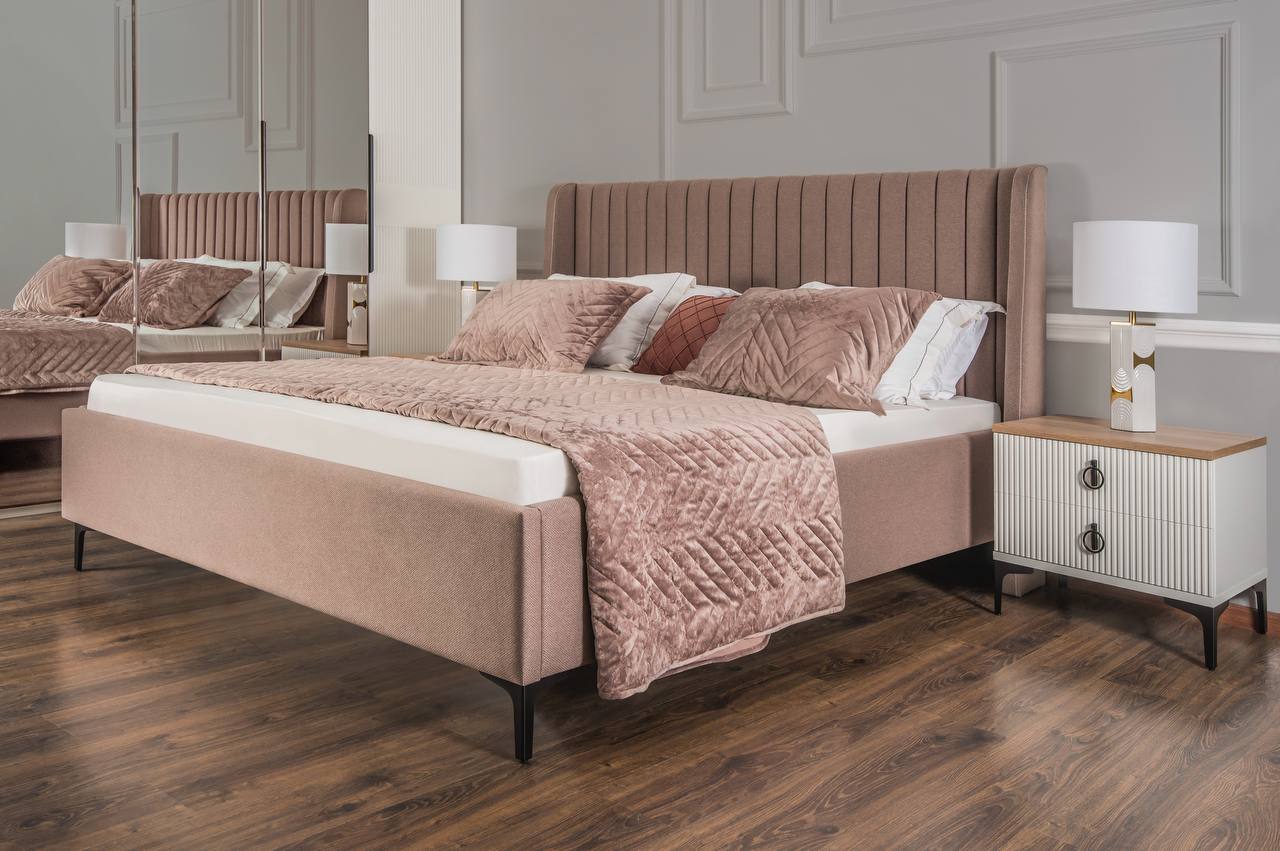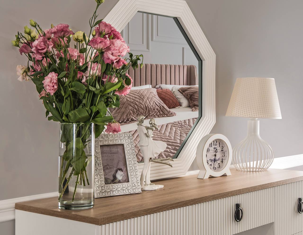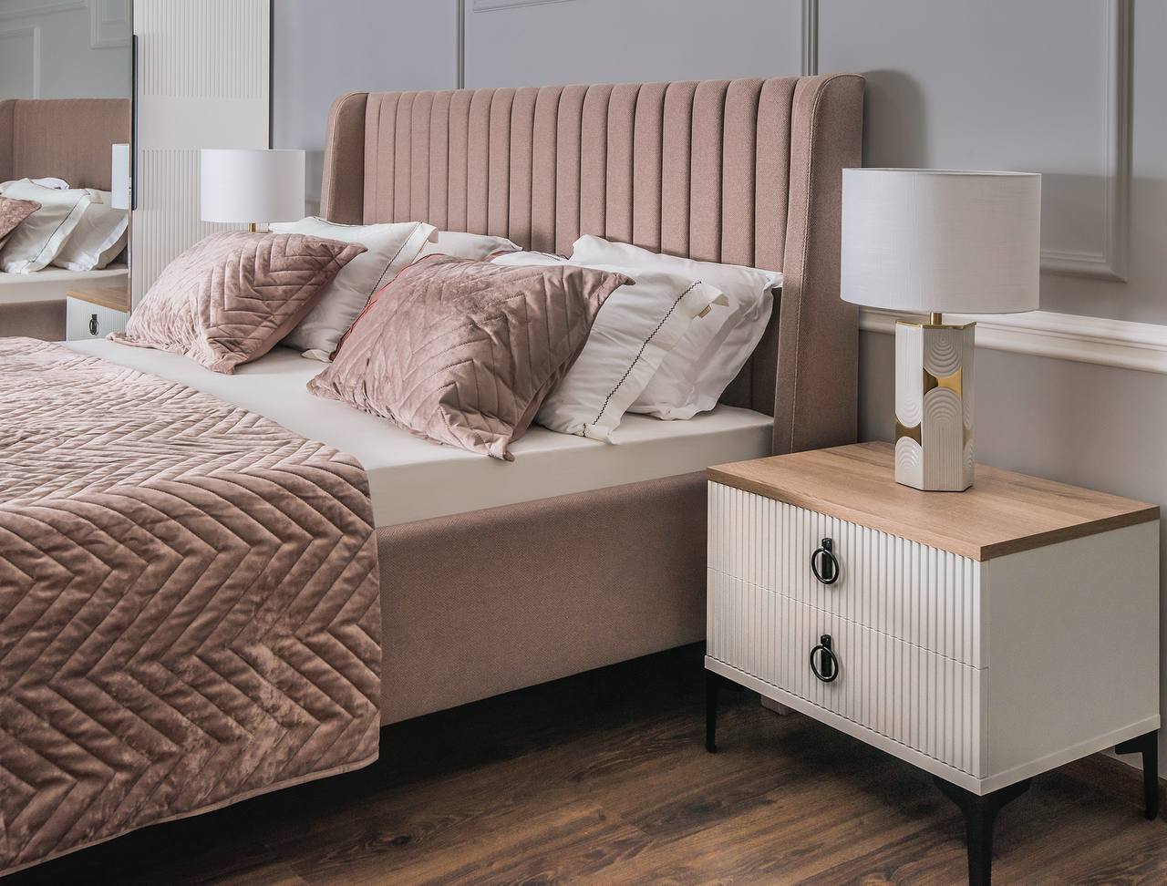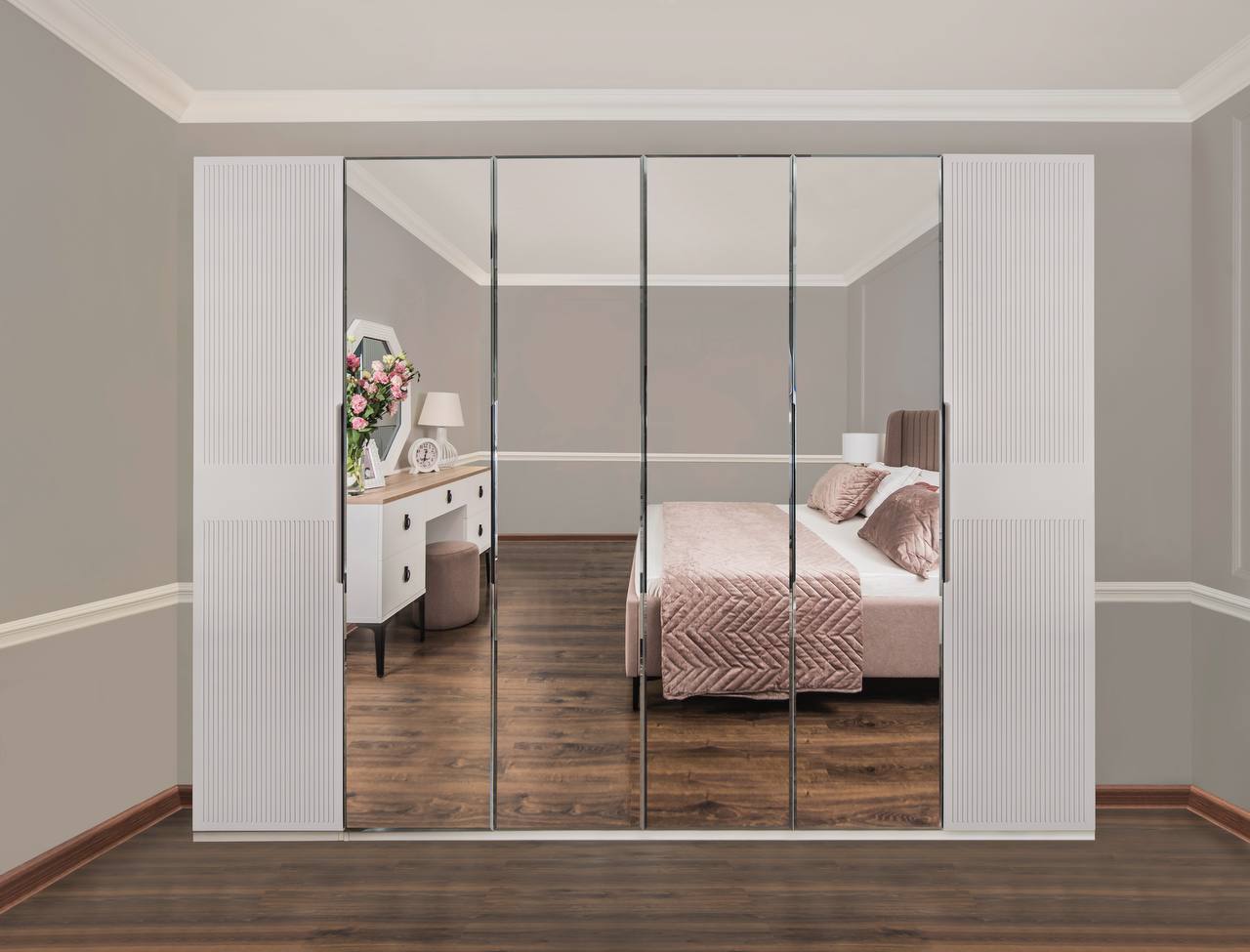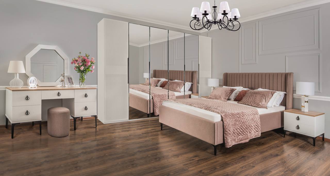 Двуспальная кровать Стелла 160 беж / Зеркало для туалетного стола Стелла белый / Туалетный стол Стелла белый / Прикроватная тумбочка Стелла белая / Шкаф Стелла 6-ти створчатый белый