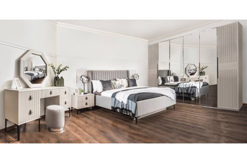 Двуспальная кровать Стелла 180 / Зеркало для туалетного стола Стелла / Прикроватная тумбочка Стелла светло серый / Туалетный стол Стелла светло серый / Шкаф Стелла 6-ти створчатый серый