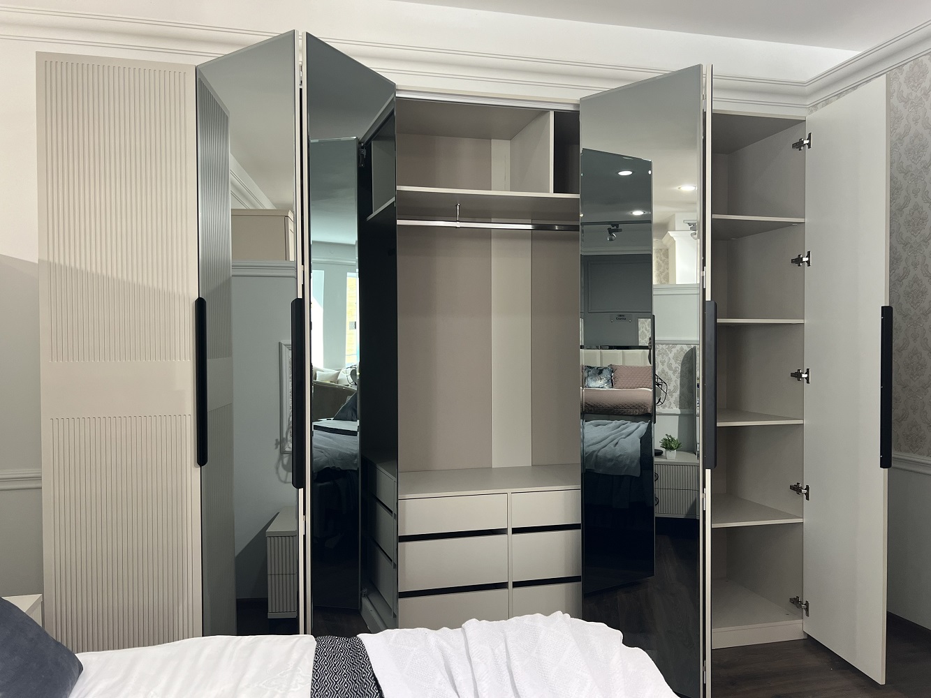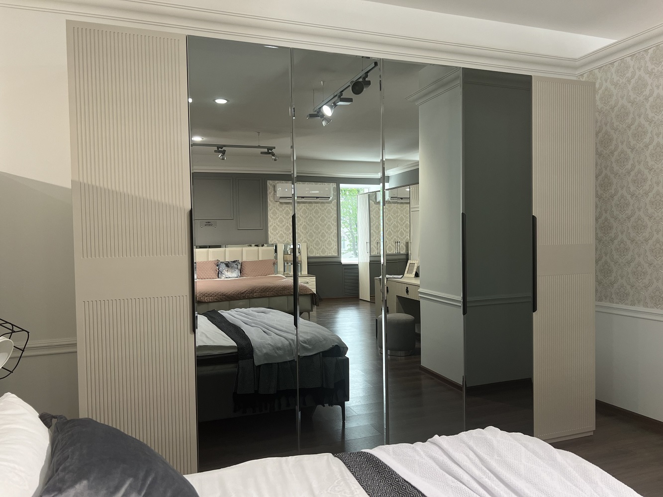 Спальня Стелла Шкаф Корпус: ЛДСП Kronospan 16 мм; Фасад: МДФ с фрезеровкой; Зеркало: 4 зеркала с фацетом, приклеивается по технологии полного закрашивания полотна клеем, дымчатая тонировка графит Внутреннее наполнение: Штанга, кассетница -6 ящиков, антресольные полки и стеллаж из 3-х полок рядом с выдвижными ящиками. Фурнитура: складной механизм Hettich (Германия) с доводчиками; Ручки: Из металла покрытие черные матовые, пр-во Турция; Особенность: Фасады шкафа раздвижные, система открывания «складная». Кровать Царги: ЛДСП Kronospan в ткани Премиум велюр. Царги центратральная и поперечная из ЛДСП, как дополнительные ребра жесткости; Изголовье:ЛДСП в ткани Премиум велюр, поперечная стяжка, форма изголовья с бортиками Изножье: ЛДСП в ткани Премиум велюр. Ткань: Премиум велюр серый меланжевый Цветовая палитра ткани мягкой обивки может незначительно отличаться и зависит от партии ткани. Фурнитура: Усиленные эксцентриковые стяжки; Высота залегания матраса: 25 см; Тумбочка Корпус: ЛДСП Kronospan 16 мм; Фасад: МДФ с фрезеровкой; Топ верхний: ЛДСП 22мм,; Фурнитура: Боярд телескопические полного выдвиженияс доводчиками; Ручки: Из металла, черные матовые, пр-во Турция Ножки: металлические, пр-во Турция; Задние опоры: Стенка задняя ХДФ Допустимая нагрузка на ящики: До 5 кг. Стол туалетный Корпус: ЛДСП Kronospan 16 мм; Фасад: МДФ с фрезеровкой Столешница: ЛДСП 22мм; Фурнитура: Боярд телескопические полного выдвиженияс доводчиками; Ручки: Из металла, черные матовые, пр-во Турция; Ножки: Металл черные матовые, пр-во Турция; Наполнение: Пять выкатных ящиков Зеркало Корпус: Зеркальное полотно на панели из МДФ Отделка: Фрезеровка, эмаль матовая ; Крепление: к стене; Зеркало: дымчатая тонировка графит Шкаф 6-х ств. - Ш 3020*Г 620*В 2295 Кровать (1800х2000) - Ш 2020*Г 2080*В 1285 Тумбочка (2 шт.) - Ш 605*Г 475*В 520 Туалетный столик - Ш 1520*Г 475*В 800 Зеркало ППУ - Ш 870*В 870*Г 40