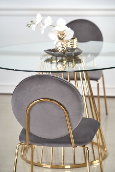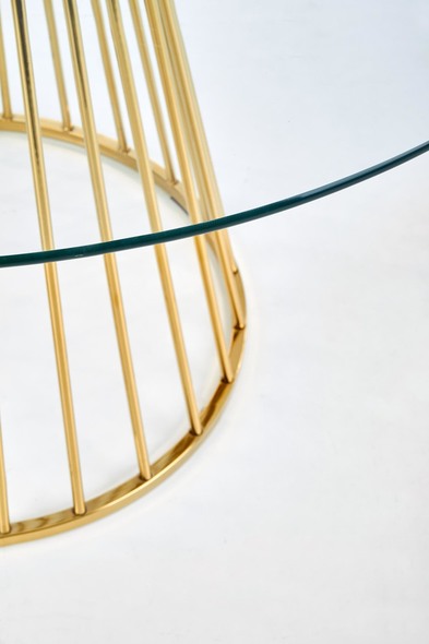 Добавьте элегантности и современного стиля в ваш интерьер с обеденным столом HALMAR LIVERPOOL. Этот стол сочетает в себе изысканность прозрачного стекла и роскошь золотого каркаса, создавая неповторимую атмосферу в вашей столовой или кухне.