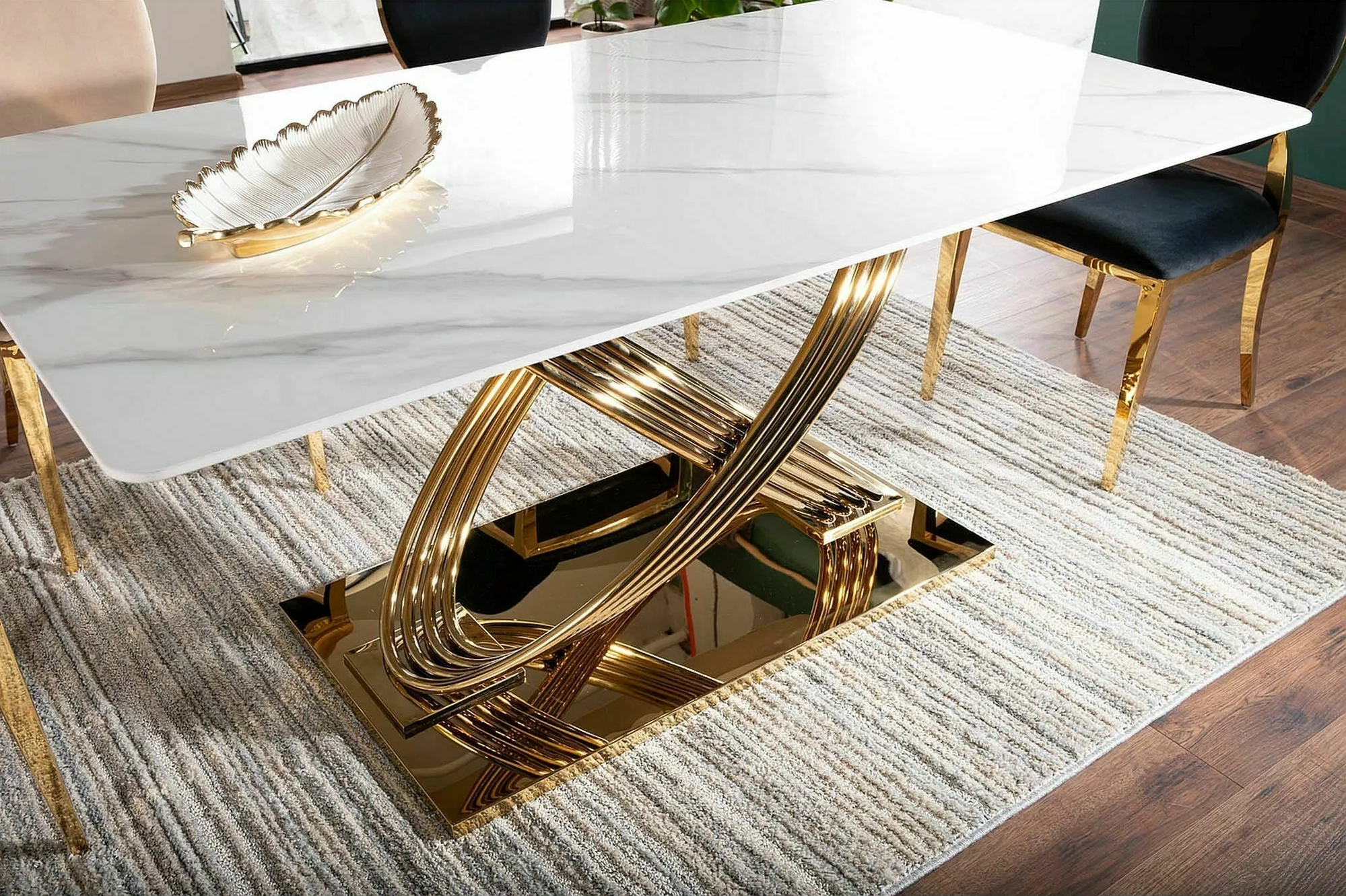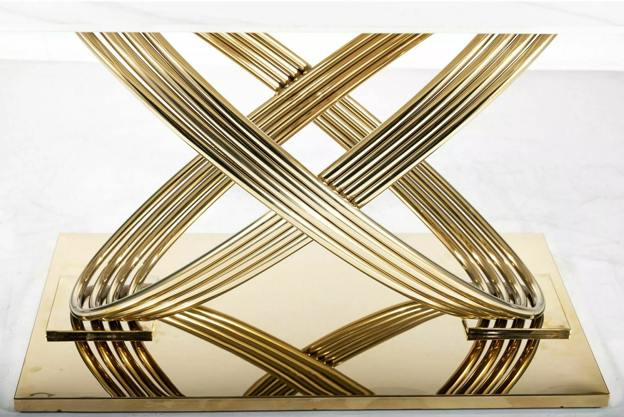 Основание стола выполнено из нержавеющей стали золотого цвета. Конструкция представляет собой оригинальные переплетающиеся линии, что: