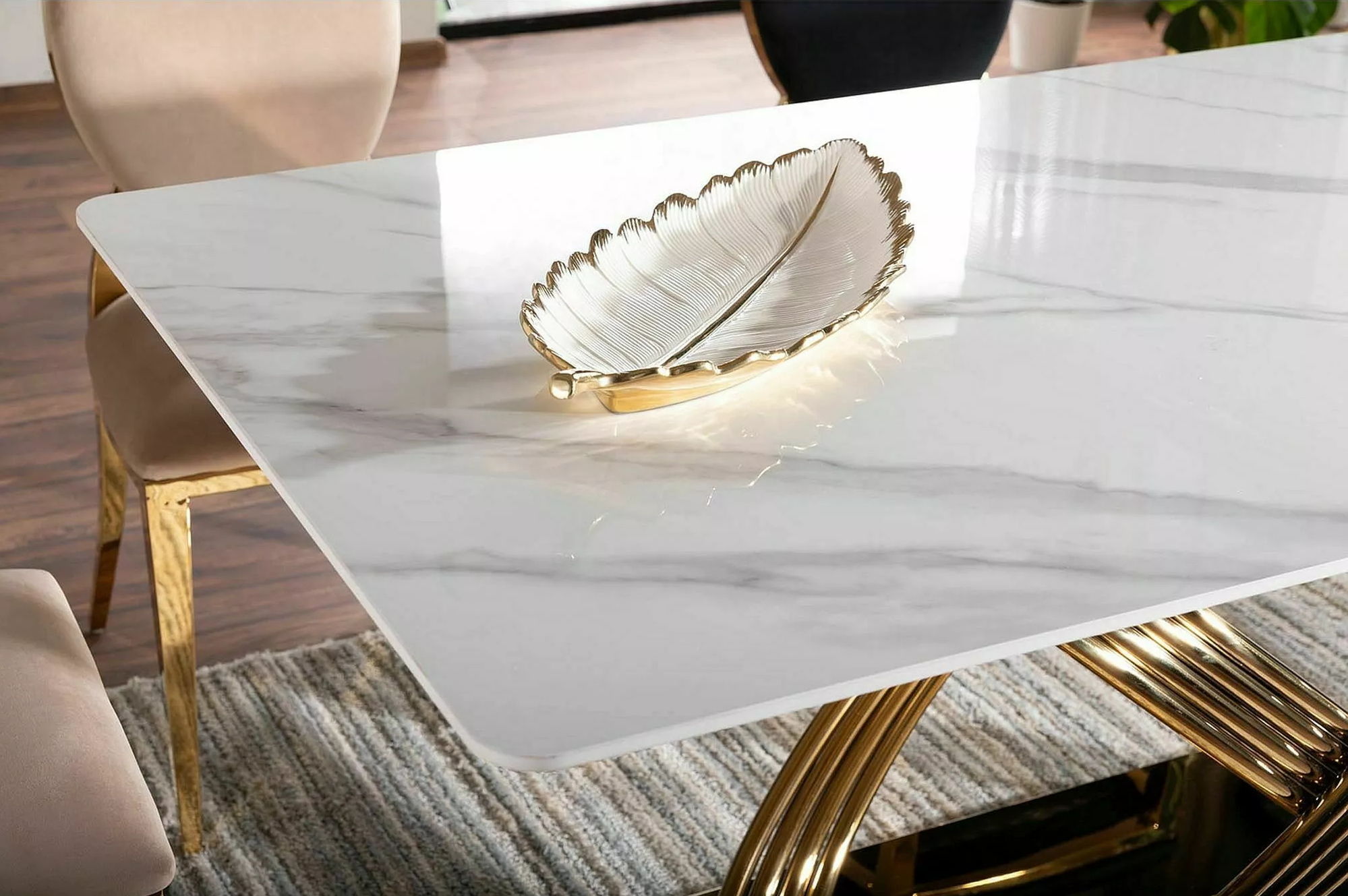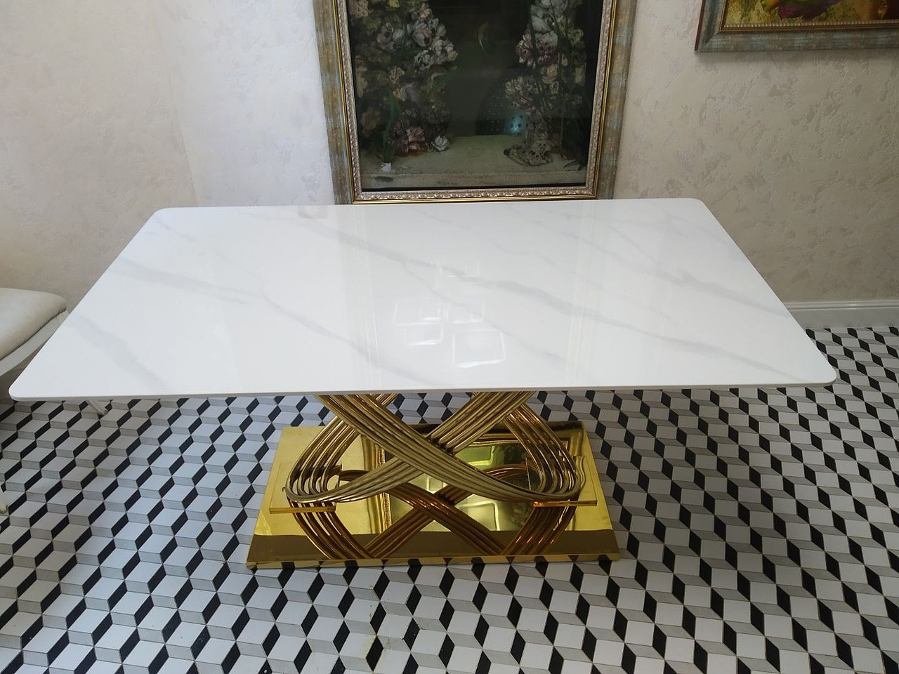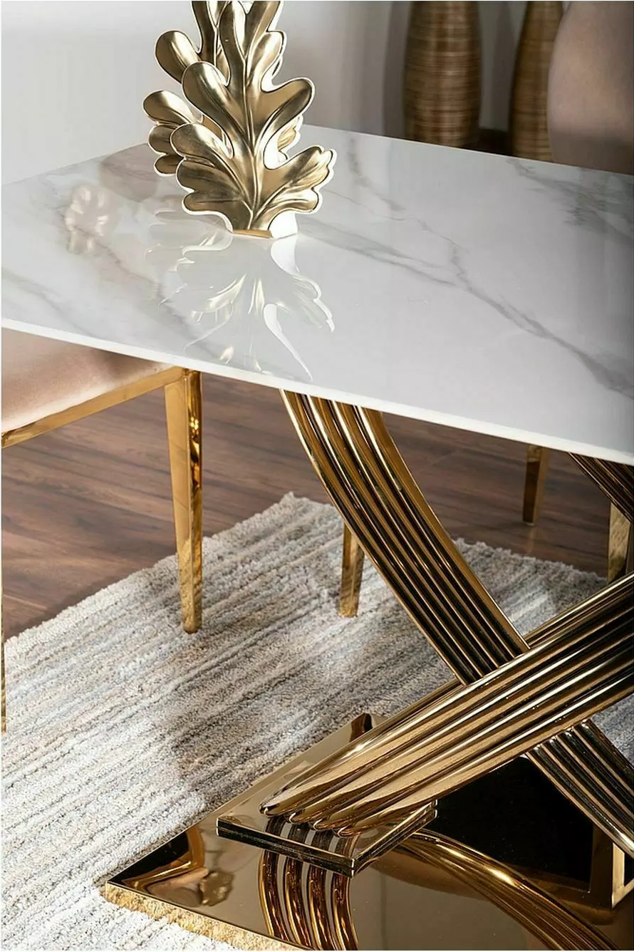 Стол выполнен в современном стиле с элементами роскоши. Он сочетает в себе элегантность белого мрамора с сиянием золотого металла, что делает его ярким акцентом в интерьере.