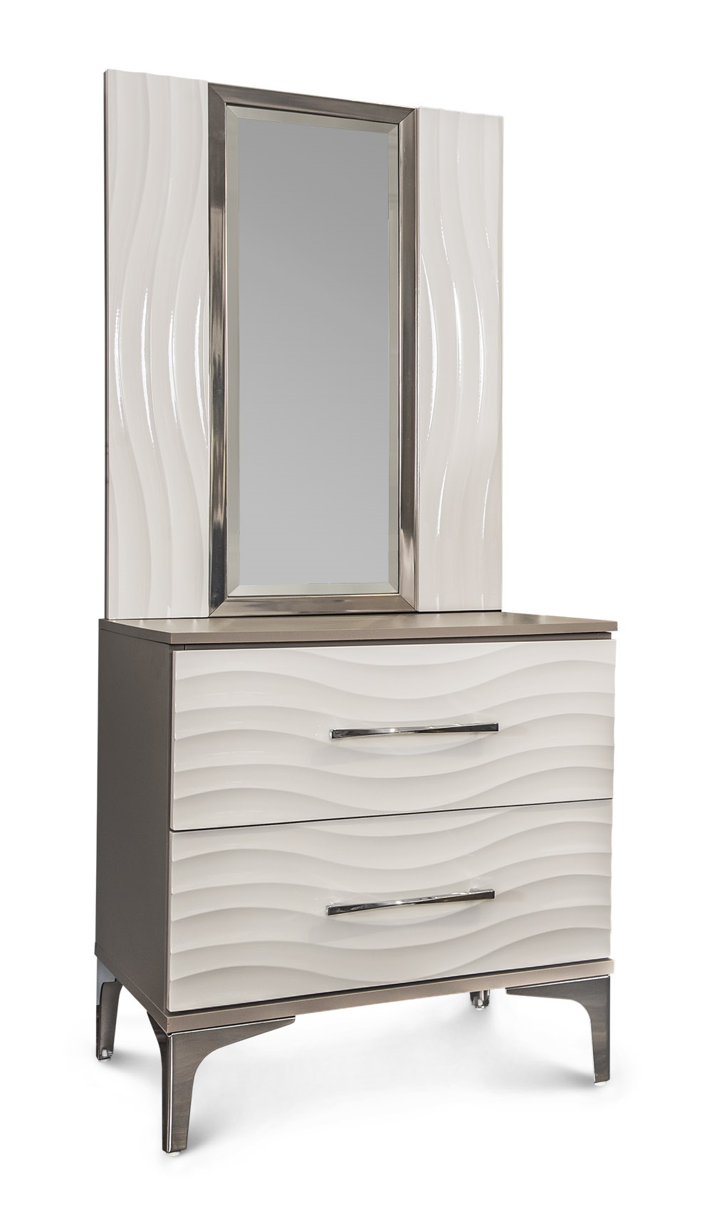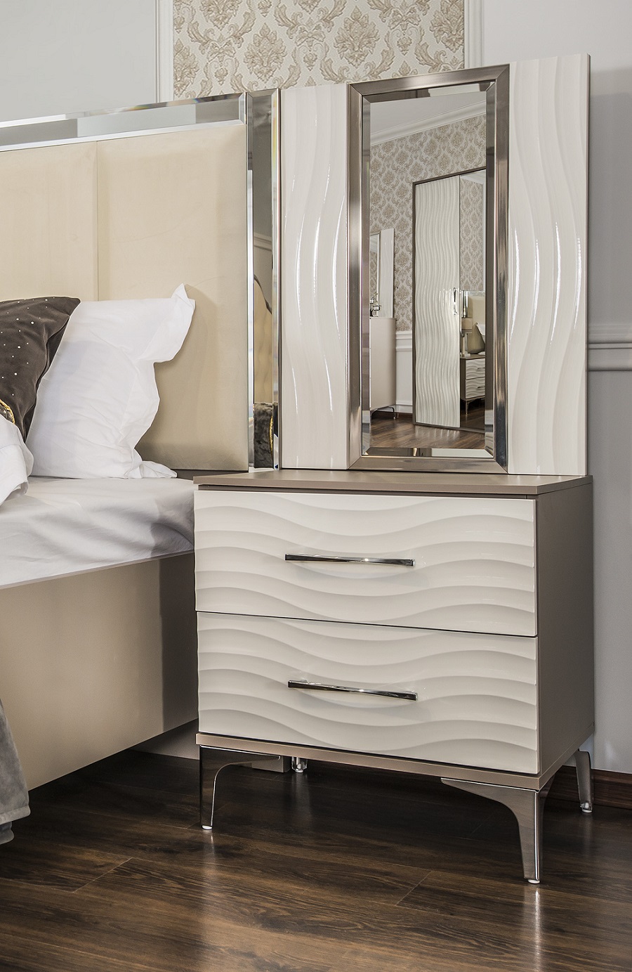 Спальня Гравита - особенная коллекция. В ней сочетаются современные тенденции и экзотический колорит, мужественность. Уютная, с модным сочетанием цветов. Корпус в цвете серый камень выгодно подчеркивает белизну глянцевых фасадов с орнаментальной фрезеровкой, а яркие декоративные элементы –акцент на нестандартность! Кровать с декоративными фацетированными зеркальными рамками на изголовье – делает ее центром притяжения! Ведь кровать в спальне главный элемент мебели! Мебель на ножках в цвете хром выглядит воздушной, не утяжеляет модули, обеспечивает легкость пространства! Наличие зеркальных элементов позволяет визуально увеличить пространство помещения! А фацеты на зеркалах создают им объем и эстетику! Гравита-находка для любителей средиземноморского стиля!