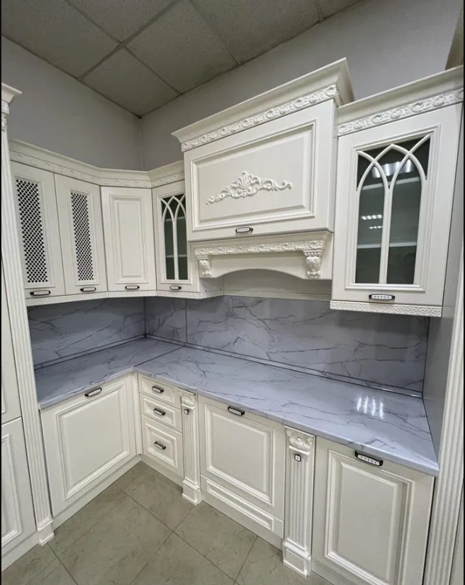 Кухня модульная "Монако" Скоплектуйте свою кухню "Монако" от фабрики Арида. Наполнение кухни "Монако" Дверные петли с доводящим механизмом Выдвижные ящики оснащены механизмом МЕТАBOX с несущей способностью до 30 кг. Столешница толщиной 48 мм. с фрезерованным краем выполнена из влагостойкого ЛДСП. Пристенный борт с плинтусом Посудосушитель Высота 2,45 м, Характеристики: Материал фасадов: МДФ фрезерованный с элементом рисунка. Покрытие: Лаковое покрытие крашенная эмаль. Корпус: ЛДСП Ваниль. Столешница: Влагостойкое ЛДСП с фрезерованным краем 48 мм. Наполнение комплекта: Шкафы нижние и верхние с фасадами. Карнизы для верхних шкафов. Петли с доводчиками. Направляющие для ящиков: Метабокс. Столешница 48 мм влагостойкое ЛДСП. Стеновая панель с пристеночным бортиком. Сушка. Кухонный гарнитур "Монако" угловой 2,40*1,20 (Белый, Мрамор белый 38мм)