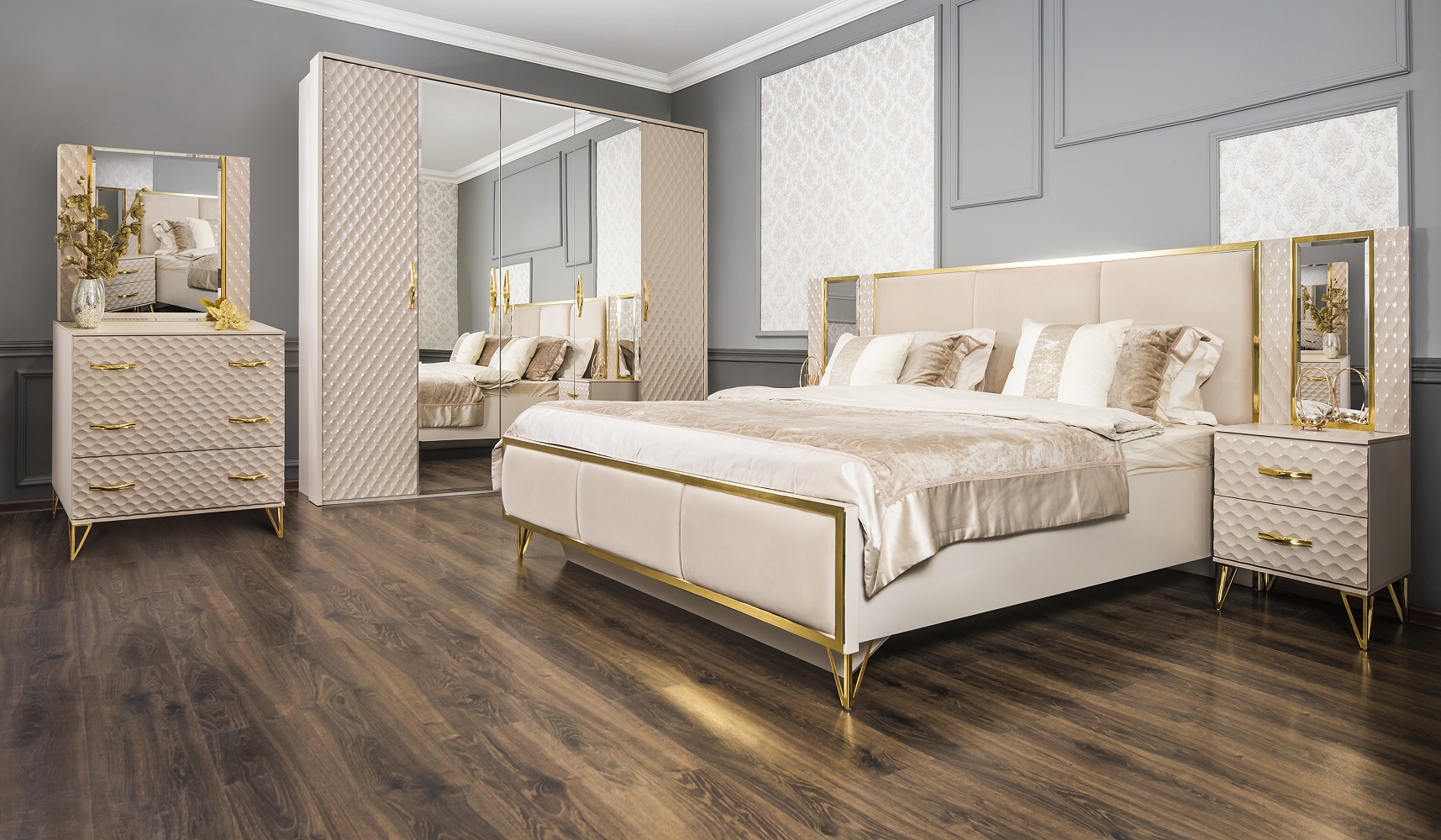 Кровать с декоративными рамками на изголовье и изножье под латунь– делает ее центром притяжения! Ведь кровать в спальне главный элемент мебели!